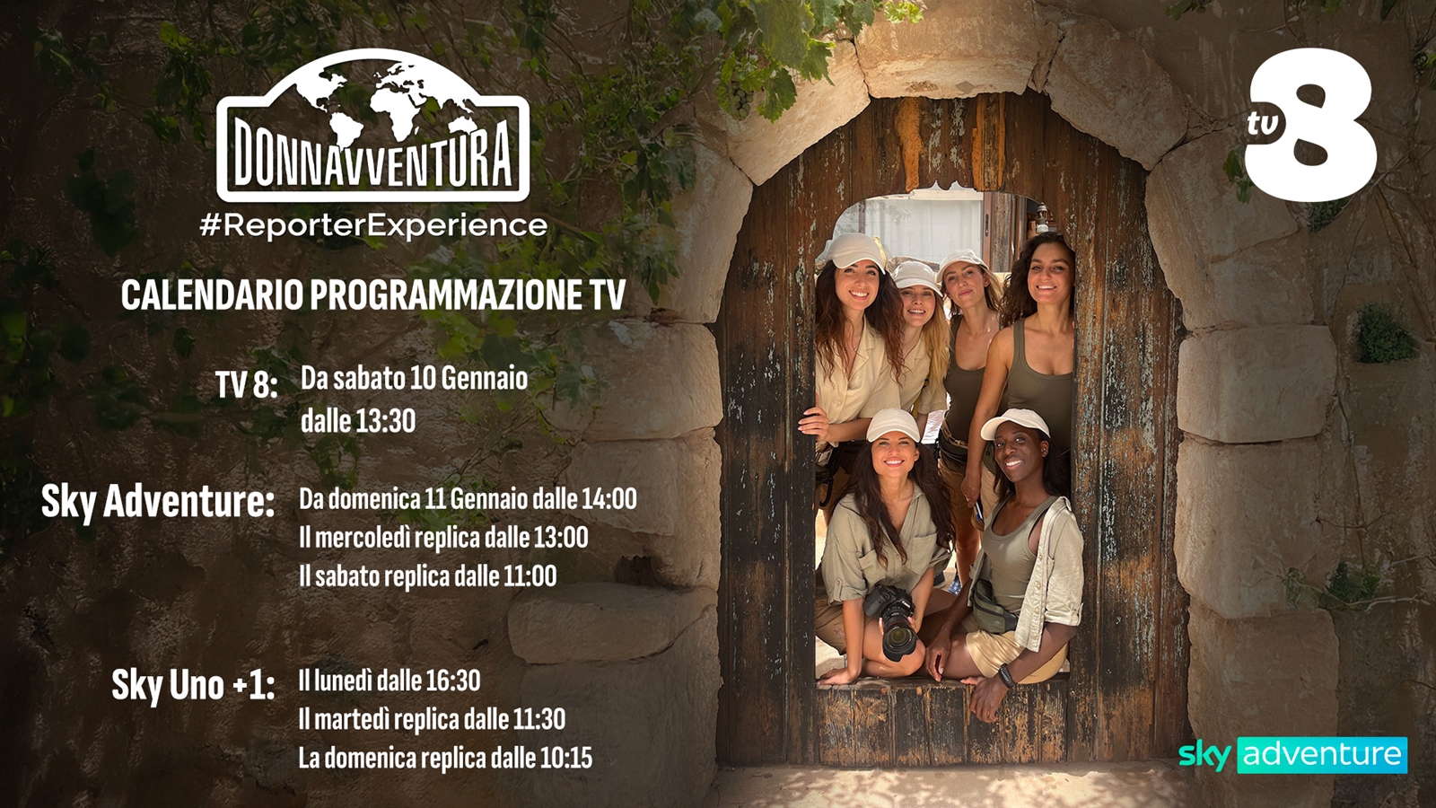 Il 2026 segna il ritorno in televisione di uno dei format più iconici del viaggio al femminile: “Donnavventura Reporter Experience” andrà in onda a partire da sabato 10 gennaio alle ore 13.30 su TV8 e da domenica 11 gennaio alle ore 14.00 su Sky Adventure, con repliche su SkyUno+1.